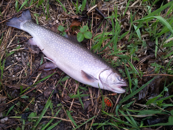 War heute wieder mal, wie sollte es anders sein, am Auschneidersee. Das eher schlechte Wetter konnte mich nicht davon abhalten eine Runde zum See zu schauen. Heute war ja der Jugendfischertag und anscheinend haben sie nicht schlecht gefangen, denn als ich um 16:00 runter kam, war keiner mehr da. Die ersten 45 min hatte ich keinen Zupfer, aber dann entschloss ich mich etwas durchs Gebüsch zu einer etwas abgelegenen Stelle zu kämpfen. Dort ging es dann Schlag auf Schlag, nach weiteren 45 min hatte ich meine vier Fische. Aber auf jeden Fall dürften die Kids erfolgreich gewesen sein, denn die Bisse waren brutal - die Saiblinge haben sich ohne Erbamen auf den Mepps gestürtzt und waren offensichtlich noch in derselben Beisslaune wie gestern. Leider ist beim Drill nach 30 sec der Spass vorbei - die werden sofort müde und schlagen dann nur mehr ein bisserl mit dem Kopf, eine energische Flucht oder gar ein Sprung ist sicher nicht zur erwarten - na ja, sind ja simple Satzsaiblinge, was will man erwarten. Aber schön sind die Fische allemal! Alle Saiblinge dich ich gestern oder heute gefangen habe, waren völlig in Ordnung und hatten doch ein festet Fleisch - seht selbst......
