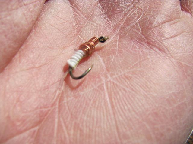 Nun, was soll´s. Dann versuche ich es halt mal mit einer Eigenkreation, die eine Köcherfliegenlarve ähnlich schauen soll. (Wer lacht da?)