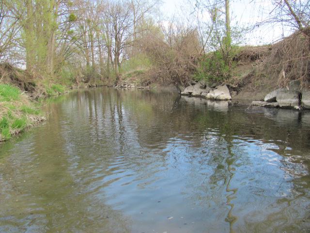 Über eine Kiesbank kam ich zur nächsten größeren Gumpe. Hier war das Wasser etwa 1.5m tief, doch nur ca. 4m breit. Ein schöner Uferstreifen war begehbar. Ich versenkte die Nymphe und srippte sie durchs Wasser. Nix, gar nichts. Da muss doch was sein.