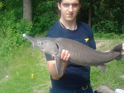 „WTF!!!! Das kann nur ein Großer sein!“, dachte ich. Als ich meine Bremse härter stellte, flüchtete der Fisch trotzdem noch mit voller Geschwindigkeit. Als er dann etwa 50 Meter Schnur von der Rolle gerissen hatte, stoppte er. Jetzt versuchte ich ihn an die Oberfläche zu pumpen. Das gelang mir auch nach einer Weile. Schließlich erhob sich der riesige Schädel eines Störs aus dem Wasser. Ich schaffte es, ihn dann noch in die Nähe des Ufers zu bringen. Da sahen wir seinen Körper. Er war riesig!!!! Der hatte mindestens 30 Kilo! Da flüchtete er nochmal und zog Richtung Grund. Ich versuchte ihn von dort weg zu bekommen, da ich befürchtete, dass er meine Schnur abscheuert. Da geschah es auch schon: Das Vorfach scheuerte sich am Grund ab.