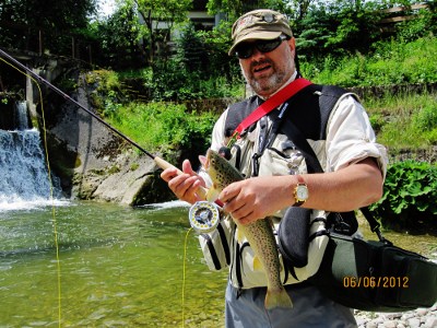 Ich erklärte im noch einmal den ganzen Ablauf vom Biss bis zum Drill, da wir ja im Bach mit Schonhaken fischen ist so ein ausstieg gleich einmal da.Zum Glück hatte ich gerade eine 40er Bafo am Haken, und so konnte er seine Rute schnell weglegen, und ich überreichte im meine Rute so das er einmal ein Gefühl für eine Fliegenrute mit schöner Bafo bekommt.(Foto 9 und 10). Und ab diesen Zeitpunkt änderte sich alles bei ihm.Es dauerte nicht lange, und er konnte schon seine erste schöne Bafo vom Bach verhaften.Ich habe schon lange kein so strahlendes Gesicht mehr gesehen, wie es Thorsten in diesem Augenblick gemacht hat Der Virus ist übergesprungen..Thorsten und ich konnten an diesem Nachmittag noch einige kampfstarke Bachforellen verhaften, aber das schönste hielt er sich bis zum Schuss auf.Nach einen Getränk im Gasthaus gingen wir noch einmal zum Wasser (Oberhalb der Ostermayr-Wehr.Wir befischten den Staubereich nebeneinander und wie es so kommen musste, habe ich meinen Woolly in einen Baum gesetzt, und Thorsten ging weiter, weil ich erst meinen Woolly vom Ast lösen musste. Und genau in diesem Augenblick bekam Thorsten einen gewaltigen Einsteiger von einer Bachforelle, und jetzt konnte er zeigen was er an diesen Tag gelernt hatte.Er Drillte die sehr große Bachforelle sehr gekonnt aus, und konnte sie mit Hilfe von mir Keschern.Kaum im Kescher hatte sich auch der Schonhaken schon gelöst.Eine riesige Freude kam über ihn, hatte er doch die größte Forelle des Tages verhaften können.Da es zu Regnen begann machten wir für heute Schluss.Er hat sich ja für Samstag auch eine Lizenz mitgenommen, und so kommen wir ja noch einmal an diesen wunderbaren Bach zusammen um die Fliege zu Wacheln.