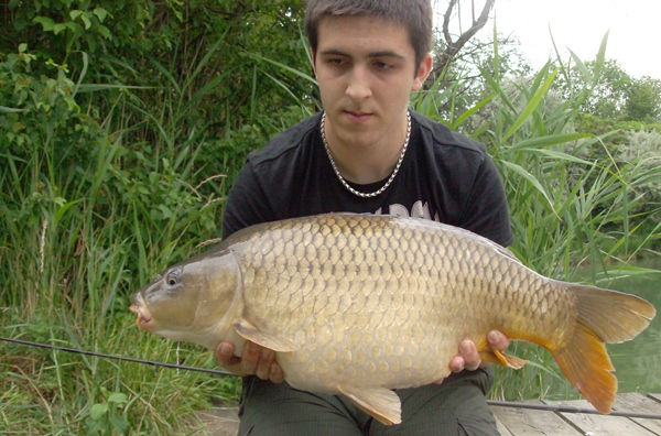 Am Teich angekommen, warf ich eine Montage an eine Kante, die schräg von zwei auf drei Meter abfällt und die andere legte ich in der Nähe von versunkem Holz ab. Es war bewölkt und etwas windig, aber Hauptsache ich war alleine am Wasser. Ich sah einige kleine Karpfen in der Ferne springen. Erst geschah lange Zeit gar nichts, bis dann endlich der Bissanzeiger nach Hilfe schrie. Ein Fisch zog mit voller Kraft ins Schilf. Ich hielt die Spule mit der Hand fest, um ihm keine weiteren Meter zu geben. Die Rute bog sich fast zum Halbkreis. Ich bin kein Freund solcher harten Drills, aber wenn er ins Schilf schwimmt, ist er weg. Meine harte Drillweise zeigte Wirkung: Der Fisch wendete und zog ins Freiwasser. Nach langem Kampf lag dann endlich der Schuppenkarpfen auf der Matte. Für seine Länge war er schön dick.