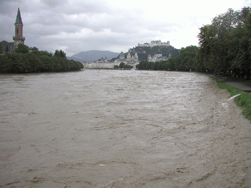Das möchte man ja nicht glauben das dies ein und dieselben Stellen sind. Ist ja gut das der Ramingbach so schnell zurückgeht. Und so siehts an der Salzach bei Hochwasser aus. Hier aus dem Jahre 2002. Wo rechts der Bach reinrinnt ist "normal" eine gute Fangstelle.