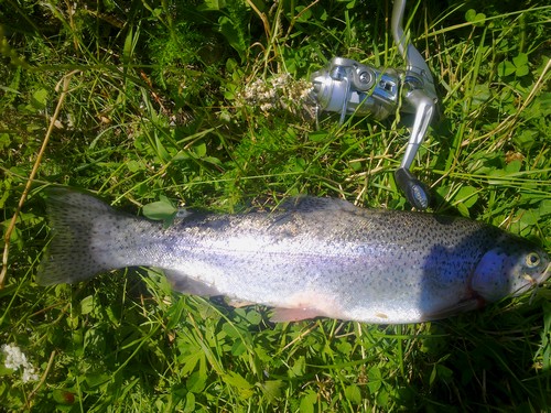 Der Wasserstand der Salzach ist seit gestern um einen Meter zurückgegangen und so dachte ich mir kann man es ja probieren. Also auf zum Almkanaleinfluß in Mülln . Dort angekommen sah ich das die Salzach immer noch als total braune Brühe daherfloß. Aber dafür war das Wasser des Almkanaleinflußes bedeutend sauberer geworden als gestern. Zuerst gleich mal mit Bienenmaden probiert und gleich beim ersten mal reinhalten hatte ich schon enen Biß. 32 cm Regenbogen die ich wieder frei ließ. Dann nahm ich den Scheiblettenkäse und hatte gleich den nächsten Biß. Dieses mal war die Regenbogen schon größer. Eine 40er mußte sich bald darauf ergeben. Dann noch eine 32 cm Forelle und wieder zurück ins Wasser. Zuletzt fing ich noch einen schönen Regenbogenmilchner ( 43 cm ) auf roten Forellenteig mit Gliter von Quantum. Dieser Teig ist ganz neu rausgekommen und hat einen extremen Fischgeruch. Alles in allem habe ich an der einen Stelle ( 20 m2 ) Wasserfläche in einer guten Stunde 5 Regenbogenforellen gefangen.