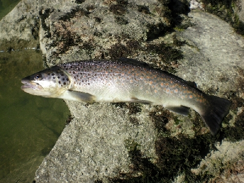 Leider war der Wasserstand ziemlich niederig und die Strömung ein bisschen zu wenig,aber zu meiner Überraschung stieg nach etlichen untermaßigen auch schon nach einer halben Stunde eine schöne Bachforelle ein.Nach kurzen drill war die Kälte auch nicht mehr so dermasen das Problem