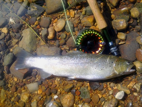 Da dieses Wochenende wieder mal Schmuddelwetter angesagt ist, hab ich mir heute Nachmittag Zeitausgleich genommen und bin mit der Fliegenrute zur Oberen Glan aufgebrochen. Zuerst hab ich die großen Äschen bei der Nepomukbrücke gesucht , aber nichts davon gesehen. Stattdessen hab ich dort ein paar kleine Bafos gefangen. Dann gings weiter zur Wehr. Die Sonne brannte auch schon wieder ordentlich herunter. Das Wasser der Glan war klar aber etwas höher wie sonst um die Zeit. Also war die Wehr etwas schwieriger zu befischen. Nach einigen kleineren fing ich endlich was maßiges. Eine Bafo mit 33 cm schön gezeichnet. Nach etlichen Würfen mehr hatte ich einen harten Biß den ich sogleich parierte. Die Forelle sprang gleich einen Meter aus dem Wasser und gab ordentlich Gas. Nach etlichen Fluchten konnte ich eine Bachforelle mit 39 cm und wohlgenöhrt landen. Da die Sonne immer unbarmherziger wurde beschloß ich dann nach hause zu fahren.
