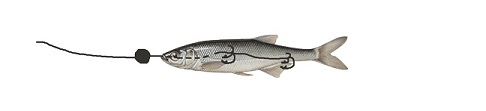 Ein Stahlvorfach an dem sich ein Karabinerwirbel befindet wird mit einer Ködernadel bis kurz hinter die Kiemendeckel geführt. Dort wiederum wird ein kurzes Stück Stahlvorfach mit 2 oder einem Drilling eingehängt. Diese befestigt man dann am Köderfisch. Danach klemmt man ein relativ großes Klemmblei mit ca. 5 Gramm vor das Maul des Fisches.