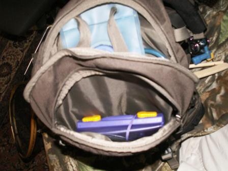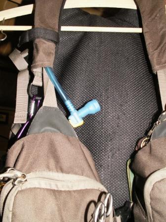 Digicam mittels Karabiner eingehängt. Ebenso am linken Träger das Mundventil meines Camel Bag.