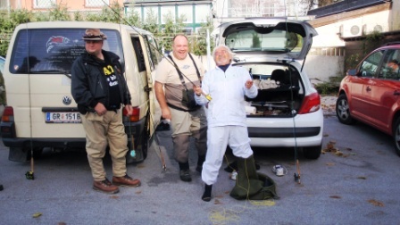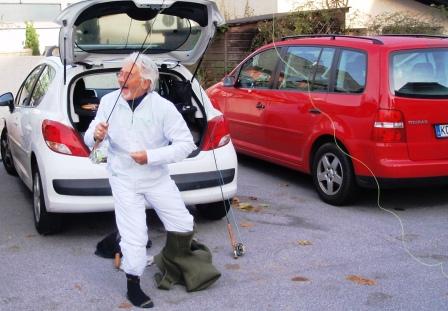 Einer ist vor lauter Begeisterung gleich gar nicht ganz in seine Wathose geschlüpft.