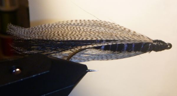 Der geschenkte Streamer war vom Körper her etwas gelblich, mit gelbem Schwänzchen und mit grauen Mallard-Federn. Den hab ich seither in diversen Farbkombinationen nach gebunden. Die hell- bis dunkelgrauen Federn blieben allerdings immer der wichtigste Teil des Streamers.