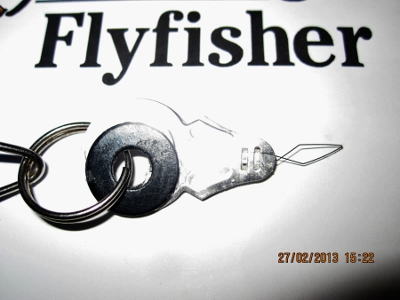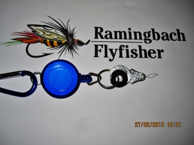 Da ich mir schon etwas schwerer beim "Einfädlen" des Vorfaches in ein kleineres Hakenöhr tue, habe ich mir jetzt eine schnelle Hilfe gemacht. Einen Nadel-Enfädler mit einen Aktenlocher gestanzt, und als Verstärkung zwei leichte Beilagscheiben mit Superkleber befestigt. So konnte ich problemlos einen Schnuraufroller mit Sprengring befestigen.
