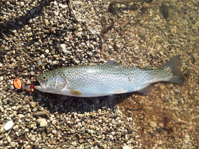 Doch dann um halb 10 konnte ich eeendlich einen ordentlichen Biss verzeichnen und den Fisch auch landen: Eine makellose 37cm große Regenbogenforelle. Der Saisonstart am Auschneider war geglückt! :-__