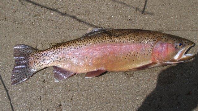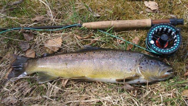 Auf die Trockenfliege beißen die kleinen Forellen und Äschen. Auch auf die Nymphe kommt nichts vernünftiges an den Haken. Dann der Wolly, die erste Regenbogen hat 42 cm, dann eine 36er Bachforelle. Dann geht längere Zeit nichts.