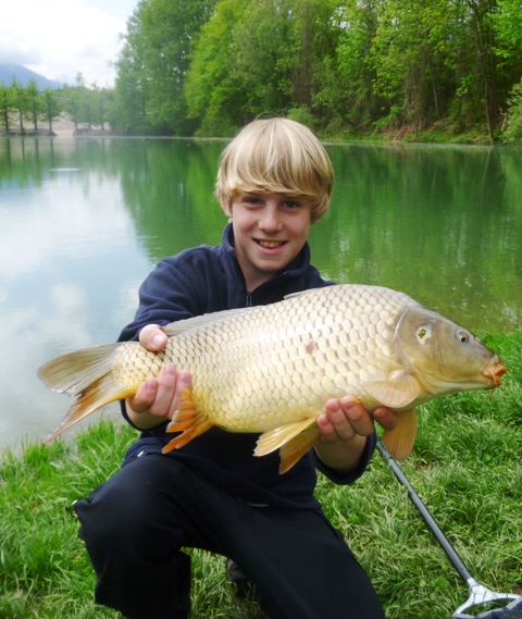 Auf Forellen ging nichts, also hab ich alles auf Karpfen umgebaut, mit Erfolg. Es ging plötzlich super. Ich hatte einige Bisse und konnte insgesamt 6 Karpfen landen. Einen ließ ich dann Johannes drillen, der zu mir gesagt hat, dass er noch nie einen Karpfen gefangen hatte. Der nächste Biss gehörte ihm und mit etwas Hilfe für den Umgang mit der Karpfenrute konnte er einen wunderschönen Schuppi landen. Die Freude sieht man ihm am Foto auch noch an.
