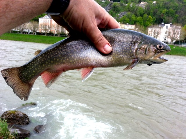 Was ich nicht geglaubt hätte ist mir heute nachmittag passiert. Voriges Jahr sin d ja im Herbstbesatz der Oberen Salzach ziehmlich viele Bachsaiblinge dabeigewesen. Bachsaiblinge haben ja den zweifelhaften Ruf richtige Zigeuner zu sein. Kaum eingesetzt sind sie schon Kilometerweit den Fluß runter. Darum setzt sie auch kein Verein der ein kleines Revier hat gerne ein. Aber siehe da - heute Nachmittag fischte ich in der Nähe der Nonntalerbrücke und konnte noch so einen Herbstsaibling ergattern. Ein gutes Stück für die Pfanne.