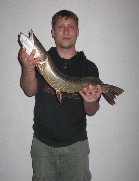 Nach ungefähr 10 min Drill dirigiere ich einen wunderbar gezeichneten Esox in meine Richtung und über den Kescher.