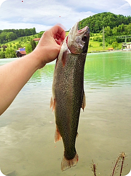 Nach kurzen Drill war die 50er Regenbogenforelle an Land.