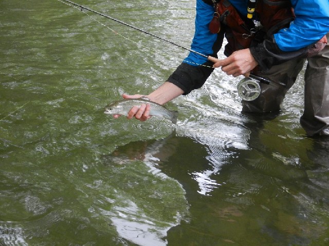 So, und jetzt war Matthias‘ Zeit gekommen. An derselben Stelle, nur am anderen Ufer (Da Matthias Linkshänder ist und ich mit Rechts werfe, ist die Aufteilung des Flusses vorgegeben- er macht das rechte, ich das linke Ufer) konnte Matthias 2 schöne Bachforellen überzeugen auf seine Nymphe zu reagieren und konnte beide auch landen. Die eine hatte 34cm und durfte sich später Matthias' Pfanne genauer ansehen und die andere war mit 28cm natürlich zu schade zum Mitnehmen.