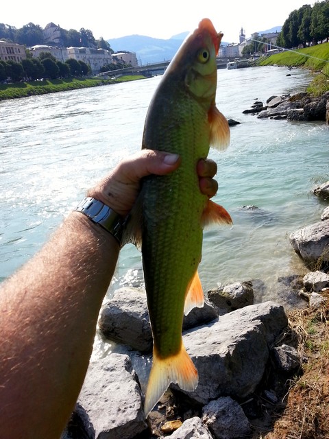 Auf einmal spürte ich einen ganz zarten Zupfer und schlug gleich an. Ah dachte ich mir, hab ich doch noch so eine launische Forelle erwischt. Als der Fisch einmal kurz oben war glaubte ich eine Äsche zu sehen. Als dann der Fisch Flanke zeigte sah ich erst das es sich dabei um eine in der Salzach sehr seltene Nase handelte. Sie dürfte um die 50 cm gehabt haben. Habe sie aber ohne Abmessen gleich wieder zurückgesetzt. Freute mich darüber aber mehr als wenn es eine Forelle gewesen wäre.