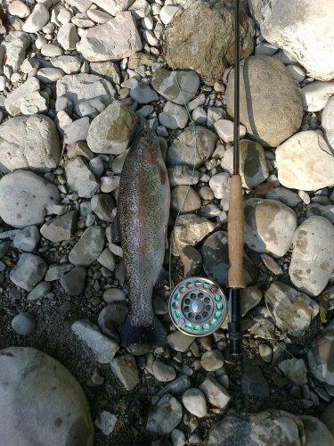 Nach ein paar Wurfübungen hab ich dann meine Nymphe stromauf präsentiert, ein paar Mendings reingeworfen damit sie auf tiefe kommt und in dem Moment als ich dachte jetzt müsste die Nymphe die richtige Tiefe haben, zog die Schnurspitze auch schon davon... Anschlag und es war schon einer am Haken und kein schlechter....
