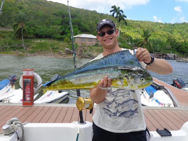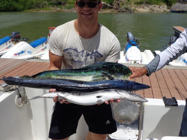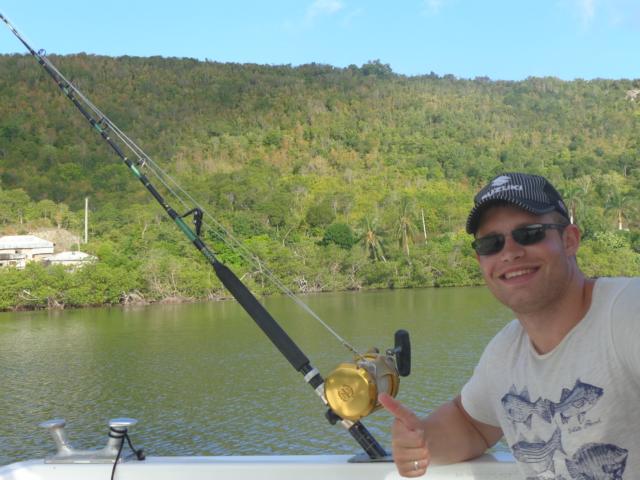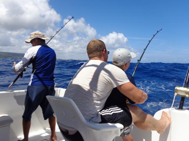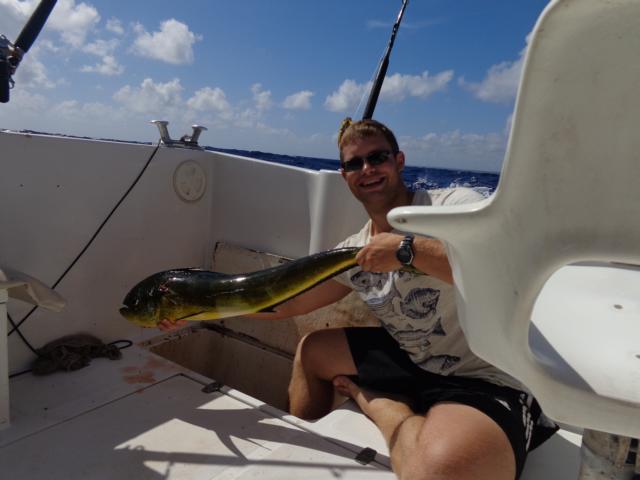 Aus dem Fotos wurde dann nur ein Foto da ich direkt wieder an eine andere Angel musste. Diesesmal war es ein Wahoo mit 110cm den ich Drillen durfte. Nach ca. 20 Minuten hatten wir einen kleinen Babythunfisch am Haken der nach einem kurzen Drill ausschlitzte. Danach war ruhe und ich entspannte mich ein bisschen auf dem Boot. Auf dem Rückweg bog sich dann nochmal eine der Angeln und der kleine durfte noch einmal einen 80iger Barracuda mit meiner Hilfe ans Boot ziehen. Um 12 Uhr ging es dann wieder in Richtung Hotelanlage.