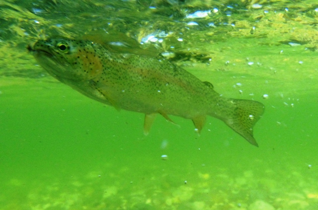 Die kleinere Regenbogenforelle hat sogar vor lauter Freude