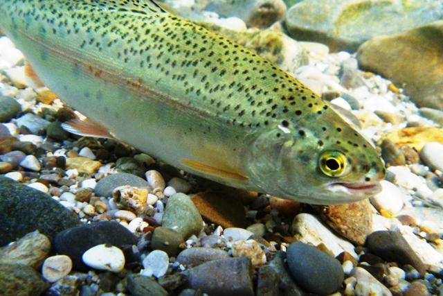 Die kleinere Regenbogenforelle hat sogar vor lauter Freude