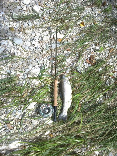 Danach wechselte ich die Stelle und als ich meine Nymphe verlor, probierte ich es mit einem Bachflohkrebsimitat... und die Entscheidung war richtig, nach ein kurzer Zeit hatte ich einen schönen Fisch am Haken welchen ich nach schönen Drill dann auch landen konnte, obwohl die Landung in der Stömung nicht so einfach war. Es war eine schöne RF mit 36 cm. Kurze Zeit später fing ich noch eine untermassige BF welche sich noch im Wasser abködern durte. Danach war vorerst Schluss und ich welchselte den Platz wo ich noch 2 untermassige BF fing.