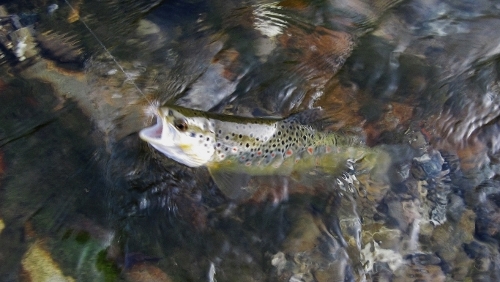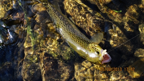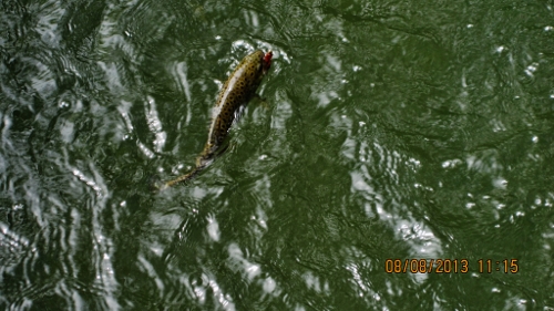 So einige sehr schöne Farbenprächtige Bachforellen konnte ich bei glasklarem Wasser mit Streamer und Trockenfliege überlisten, wobei die Trockenfliege sehr viel mehr zum Einsatz kam. Gefischt habe ich im größten teil im Abschnitt III, und dort konnte ich viele neue stellen ausfindig machen wo sich auch sehr schöne Bafos aufhielten. Durch die Baggerarbeiten war ein Teil vom Abschnitt II unter der Woche kaum zu befischen, da es zu einer erheblichen Eintrübung durch die Arbeiten kam.
