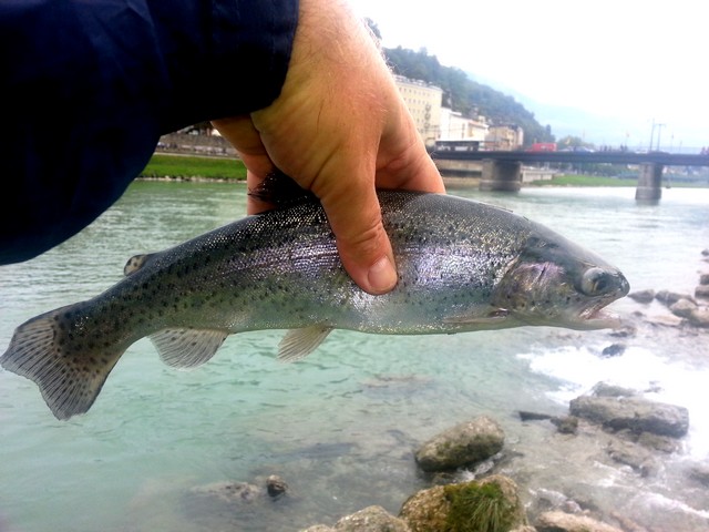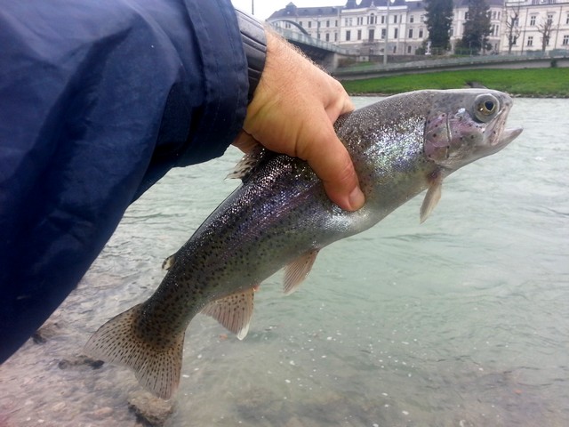 Heute nachmittag hatte ich wieder einen kurzweiligen Angelausflug an die Salzach. Das Wasser war grün und sauber - also beste Verhältnisse zum angeln. Zuerst zum 10er Revier. Eigentlich hatte ich mir an der Stelle beim Fisch Krieg mehr erwartet. Eine Regenbogenforelle gefangen und eine ausgestiegen. Dann war Schluß dort. Weiter gings zur Oberen Salzach. Fußmarsch über Stock und Stein zum Almeinfluß Höllbräu. Dort gingen zwei Regenbogen her die ich aber beide wieder frei ließ. Wieder Fußmarsch zurück zum Roller und dann noch zur Nonntalerbrücke. Dort gings Schlag auf Schlag. Gleich drei schöne Regenbogen, wobei ich eine entnahm binnen 20 Minuten. Ja jetzt im Herbst geht's wieder richtig gut in der Salzach.
