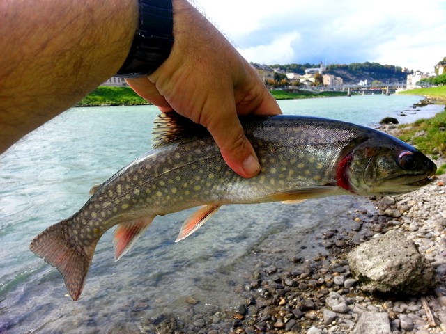 Ja Freunde, da es gestern an der Salzach so gut gegangen ist habe ich es heute gleich nochmal probiert. Morgens um 8 gings zur Nonntaler Brücke gleich nach dem Fliegenrevier. Nach ca. 15 Minuten die erste Regenbogenforelle die wieder zurück durfte. Nicht weil sie so klein war . Gleich darauf noch ein Biß - aber in typischer Saiblingsmanier. Saiblinge zupfen nicht beim Anbiß sondern ziehen dagegen. Ergebnis: ein schöner Bachsaibling mit 38 cm.