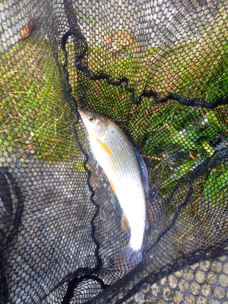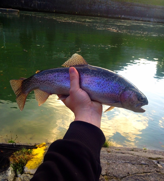 So wie so oft bei mir war der erste Wurf mit der Pose schon erfolgreich,eine 37er Regenbogen kam in den Kescher.