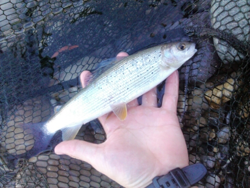 Am Wasser angekommen wurde gleich beködert und ausgeworfen, doch die Fische wollten einfach nicht... gegen 9 kamen dann 2 andere Fischer und fingen innerhalb von 1h 2 schöne Forellen. Ihre Bienenmaden wahren wohl attraktiver. Gegen 13 Uhr beendeten wir den Vormittag ohne Erfolg. Um 15 Uhr versuchten wir dann nochmal unser Glück unterhalb vom Kraftwerk, dort ging dann noch eine kleine Äsche mit ca. 25-30cm. Erst dachten wir an etwas größeres, aber die Äsche war nur in der Brust gehakt.