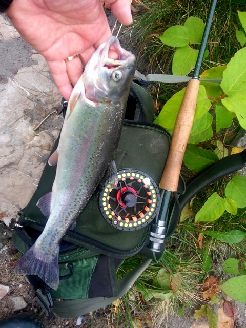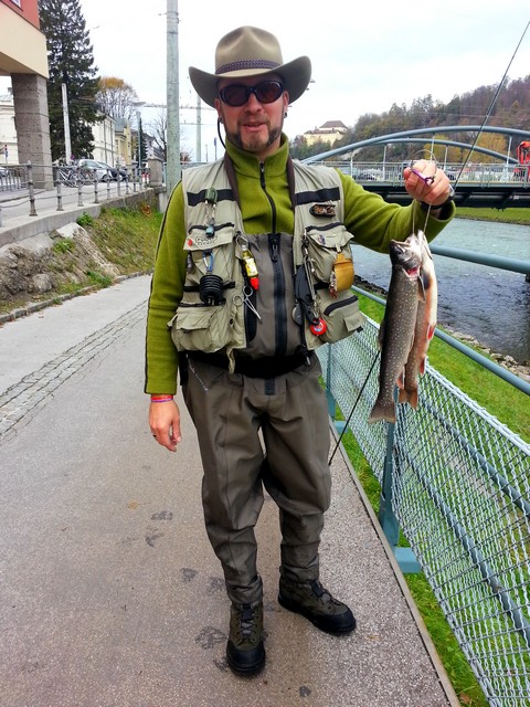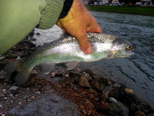 Als ich dann später wieder Richtung Nonntalerbrücke ging kam mir auch schon der APU ( Andi unter, der dann auch schon 2 schöne Saiblinge vorweisen konnte- Auch die anderen fingen durch die Bank schöne Fische. Der Nikolas fing eine wunderschöne Äsche und der Herbert unter anderem eine gut 45 cm Regenbogenforelle.