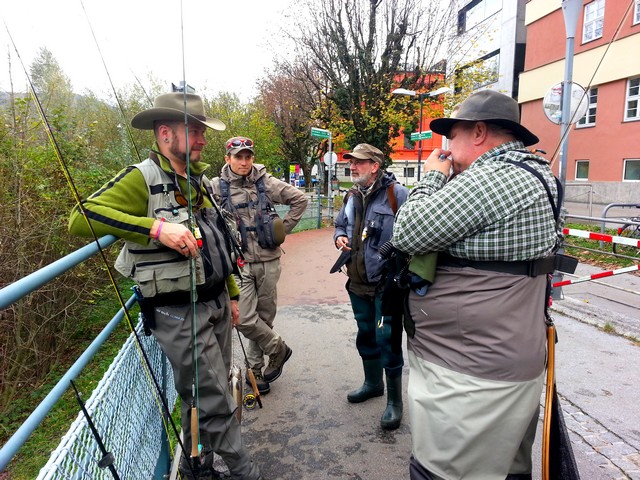 Als alle die Lizenzen hatten gings endlich zum Fischen. Plätze genug gabs ja, da heuer doch weniger Fischer als sonst kamen. Die meisten von unserem Forum stiegen bei der Nonntalerbrücke ein und fischten flußab.