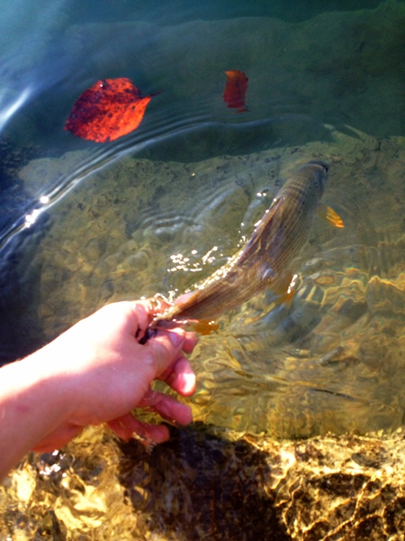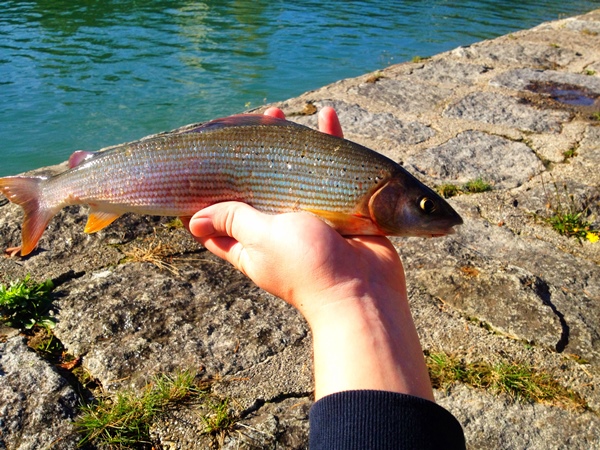 Aber schon nach den ersten Würfen konnte ich sehen das Fische hier sind,es zupfte sehr oft und ich konnte einige Bachforellen und Äschen fangen,meistens untermassig.