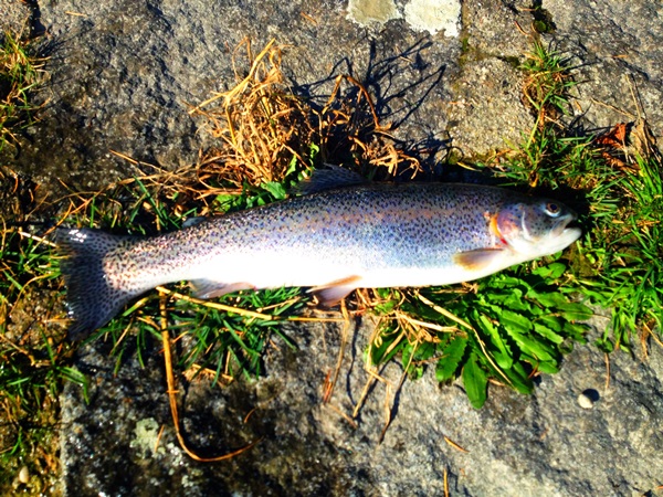Nach längeren Drill konnte ich die 48er Regenbogenforelle keschern(ich muss gestehen ich hab gedacht das sie größer war,aber war trotzdem Happy.