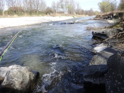 Ich bin so gegen 07:45 angekommen - hab gleich mal meine Wathose angezogen und schon gings los. Nach ca 5 Minuten Fussmarsch war ich auch schon beim ersten Gumpen angekommen. Da es derzeit noch nicht wirklich nennenswerten "Flugverkehr" gibt nahm ich meine 6er Strammer Rute mit Sinktip und band einen schweren Koppenstreamer dran (da die Gumpen 2-3m tief sind und die Fliesgeschwindigkeit ziemlich hoch ist nehme ich nur sehr schwere Streamer - nur mit diesen komme ich auch weit genug nach unten). Nach ca. 10 Würfen klopfte auch schon die Erste mal an. Da ich aber anscheinend noch nicht ganz munter war verschlief ich den Anschlag und nach einen 5 Sekunden Drill war der Fisch auch schon wieder weg. Nach gefühlten 20 Wüten im gleichen Gumpen ging dort aber nichts mehr - also ginge weiter zum nächsten Gumpen - es sind dort auf einer Strecke von ca. 1 km ungefähr 10 Gumpen. Nachdem ich auf meinem Weg einen Gumpen nach dem anderen mit meinen eher bescheidenen Wurfkünsten beglückte und sich aber nicht tat ging ich wieder zurück in Richtung geparktem Auto. Am Weg dorthin traf ich einen Aufseher und tratschte ein wenig mit Ihm. Da erfuhr ich, dass bereits ein wenig Besatz durchgführt wurde. Er erzählte mir auch, dass es in diesem Revier Bafos, Rebos, Äschen und vereinzelt Saiblinge und auch Huchen gibt (diese werden zwar nicht besetzt - aber kommen ab und zu von weiter oben liegenden Revier zu uns).