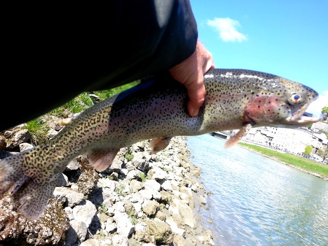 Hurra, 5 Tage frei und keine Arbeit. Da bin ich heute an die Obere Salzach gegangen um den Karfreitagsbraten zu besorgen. Ja und echt Glück gehabt. Der erste Fisch den ich auf Bienenmaden gefangen habe war gleich eine Regenbogenforelle mit satten 48 cm und wunderbar gezeichnet. Später fing ich noch eine kleinere, die ich aber da schön vorne gehakt gleich wieder dem Element übergab.