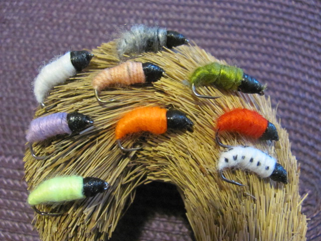 Hier mal meine Versionen dieser Madenimitation, gebunden auf Wurmhaken der Größe 8.