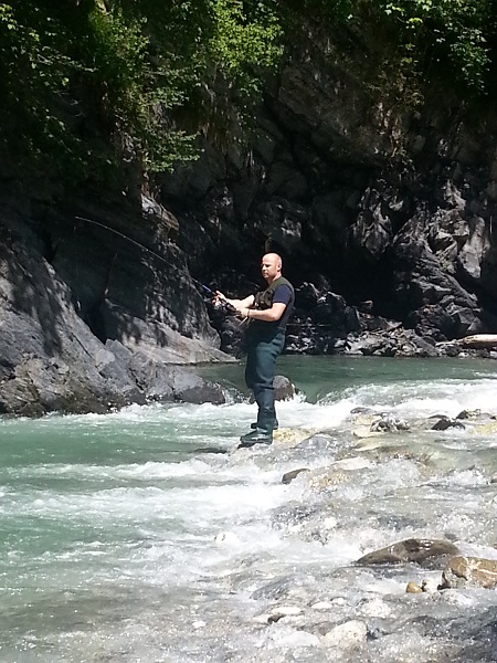 Den traurigen Tiefpunkt des Tages erfuhren wird dann bei der Einmündung in die Salzach. Wir hatten eine wunderschöne Regenbogenforelle an der Rute. Wunderschön gezeichnet gelang es sie nach einigen Sprüngen bis in Keschernäche zu drillen. Doch kurz bevor sie im Kescher landete konnte sie sich mit einem letzten Sprung vom Haken befreien. Ich schätze sie hatte so zw 40 und 45. Der Frust darüber den einzig brauchbaren Fisch verloren zu haben löste sich aber schnell wieder auf - da der Tag einfach nur traumhaft war.