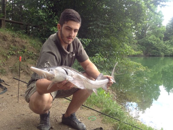 Einige Zeit später lagen dann unsere Montagen im Wasser, und es dauerte nicht all zu lange bis ich den ersten Biss hatte. So lag dann auch schon mein erster Stör im Jahr 2014 auf der Matte. Nur kurze Zeit später ging mein Bissanzeiger schon wieder in die Höhe und da lag auch schon der zweite Stör. Nun kehrte bei mir etwas Ruhe ein, dafür meldete sich bei Patrick der erste Biss. Leider riss vorm Ufer die Schnur und er verlor den Fisch. Das ärgerte ihn sehr, da die Schnur beschädigt gewesen sein musste, aber aufgeben tut man bekanntlich nur Briefe. Er warf also erneut aus. Siehe da, fünfzehn Minuten später konnte er endlich seinen ersten Stör fangen: Es war Black Beauty, so nenne ich ihn, weil er total schwarz ist und ich ihn auch fast jedes Mal fange, wenn ich hier bin. Ein alter Bekannter sozusagen :D