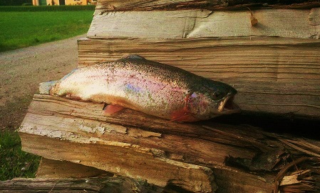 Ging zu meinem "Geheimplatz" erster Wurf und .,.....Was ist das: eine RIESEN Bachforelle gute 50cm schaute meinen Steamer an und verschwand , konnte sie auch die nächsten Würfe nicht mehr rauslocken ein paar Meter weiter bekam ich dann einen Knallharten Biss und wurde mit 15 Minuten Drill wirklich gefordert hatte eine Große Regenbogen am Haken immer wieder ist sie in die Strömung was das ganze erschwerte und ich auch schon sah das cih den Fisch nur leicht am oberen Maul gehakt habe aber gottseidank behielt ich die Nerven und wurde mit einer 50cm und 2Kg Forelle belohnt