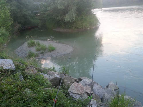 Am Wasser angekommen (Brücke Tittmoning), hab ich mal schnell zwei Hände voll Mais vorgefüttert und meine Montagen ausgelegt, eine in die Mischströmung (Nebenarm/ Salzach) und einen 5m vor mir in die Kehrströmung.