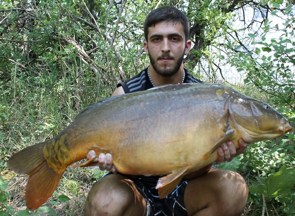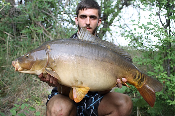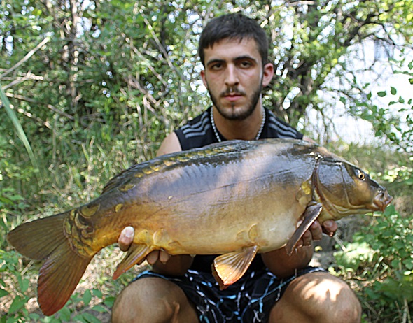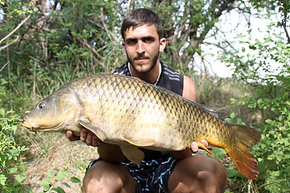 Die Sonne brannte unerbittlich vom Himmel herab, ich verstecke mich daher im Schilfgürtel auf einem schmalen Holzweg zum Steg vor dem Feuerplaneten. Ich konnte zwei Karpfen über meine Spots rollen sehen, das machte mir wieder mehr Hoffnung auf den nächsten Run, und dann schrie der Bissanzeiger tatsächlich wieder um Hilfe! Nach einem unglaublich geilen Drill konnte ich einen weiteren wunderschönen Spiegelkarpfen auf der Matte begutachten. Ich war mehr als nur glücklich. Als ich vor fünf Jahren zum ersten Mal hier Fischen war, hatte ich einen Schneider hinnehmen müssen und jetzt das! Da ging auch schon die zweite Rute wieder ab, die Fische waren voll am Fressen. Doch der Drill dauerte diesmal nicht lange, da ich ihn gleich verlor. Weshalb genau verstand ich nicht, bis jetzt waren alle Haken perfekt in der Unterlippe der Fische gehangen. Ich ärgerte mich aber nicht wirklich, da ich eh wiedermal vom Glück überwältigt worden bin, daher packte ich zusammen und dann ging es ab nach Hause!