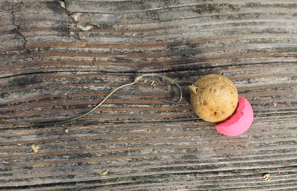 Zur Taktik: Mit einer Rute fischte ich mit Pellets in der Nähe vom Schilf und die andere Rute war mit einem Boilie und einem halbierten fluo Pop up beködert, die ich Richtung Freiwassser an einer leicht schräg abfallenden Kante präsentierte. Mein persönliches Ziel für den Tag war es, wenigstens einen Fisch zu fangen, und so machte ich mich ans Warten. Nach gut zweieinhalb Stunden ging auch endlich die Rute in Schilfnähe ab, doch das Vorfach riss. Ich war ziemlich wütend und wollte schon einen Stapel Flüche hinterherjagen, doch dann atmete ich tief durch und dachte mir nur: „Nicht aufregen, neu auswerfen und dann scheppert‘s irgendwann schon.“