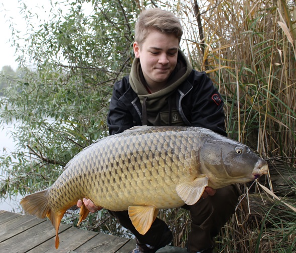 Gerade als der Lieferant anrief, bekam ich einen brutalen Vollrun. Ich beschäftigte mich also mit dem Karpfen, der mir einige Meter Schnur von der Rolle riss, während sich Gregor zum Tor begab um unser Essen abzuholen. Die Fische sind hier richtig gute Kämpfer, als Gregor mit dem Essen zurückkam, half er mir beim Keschern. Doch bevor er endgültig in den Kescher ging, startete er noch einige Fluchtversuche ins Kraut, welche jedoch allesamt unbelohnt blieben. So konnte ich nach zwei Jahren Abwesenheit hier endlich wieder einen dicken Spiegelkarpfen in den Händen halten. Jetzt war ich glücklich und mir war es egal, ob jetzt noch was beißen würde oder nicht.