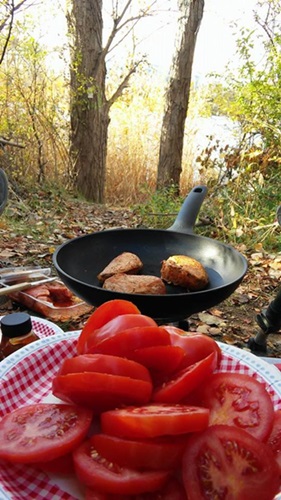 Während unsere gelben Freunde im Wasser anscheinend nichts fressen wollten, begannen wir damit. So haute ich ein paar Steaks und Käsekrainer in die Pfanne. Karpfenfischen, gutes Essen, super Herbstwetter und das auch in Gesellschaft eines Freundes!