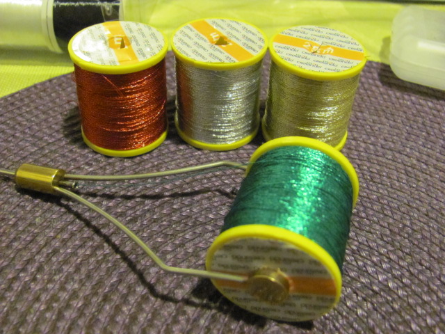 Im Nähfachgeschäft findet man immer wieder interessante Bindematerialien. In diesem Fall Metallic-Garn. Es ist zwar etwas steifer, als "normales Bindegarn" und man muss immer aufpassen, dass es sich nicht aufdrillt (besteht aus zwei verdrillten Einzelfäden), aber grundsätzlich durchaus geeignet - zumindest für meine Kebaris.