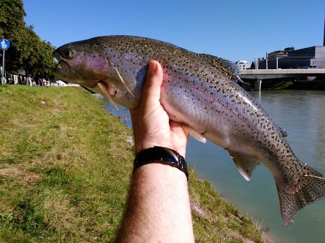Bin heute gleich mal in der Früh bei erfrischenden Temperaturen an die Salzach gefahren. Leider war das Wasser wieder mal sehr stark angestubt ( Hilfsausdruck ). Zuerst machte ich einen Versuch bei der Staatsbrücke, aber dort ging nicht viel. Ab zum Rotkreuzparkplatzeinfluß. Dort konnte ich eine 34er Regenbogen überlisten die mir sehr gesetzt vorkam.( dunkler Milchner ).